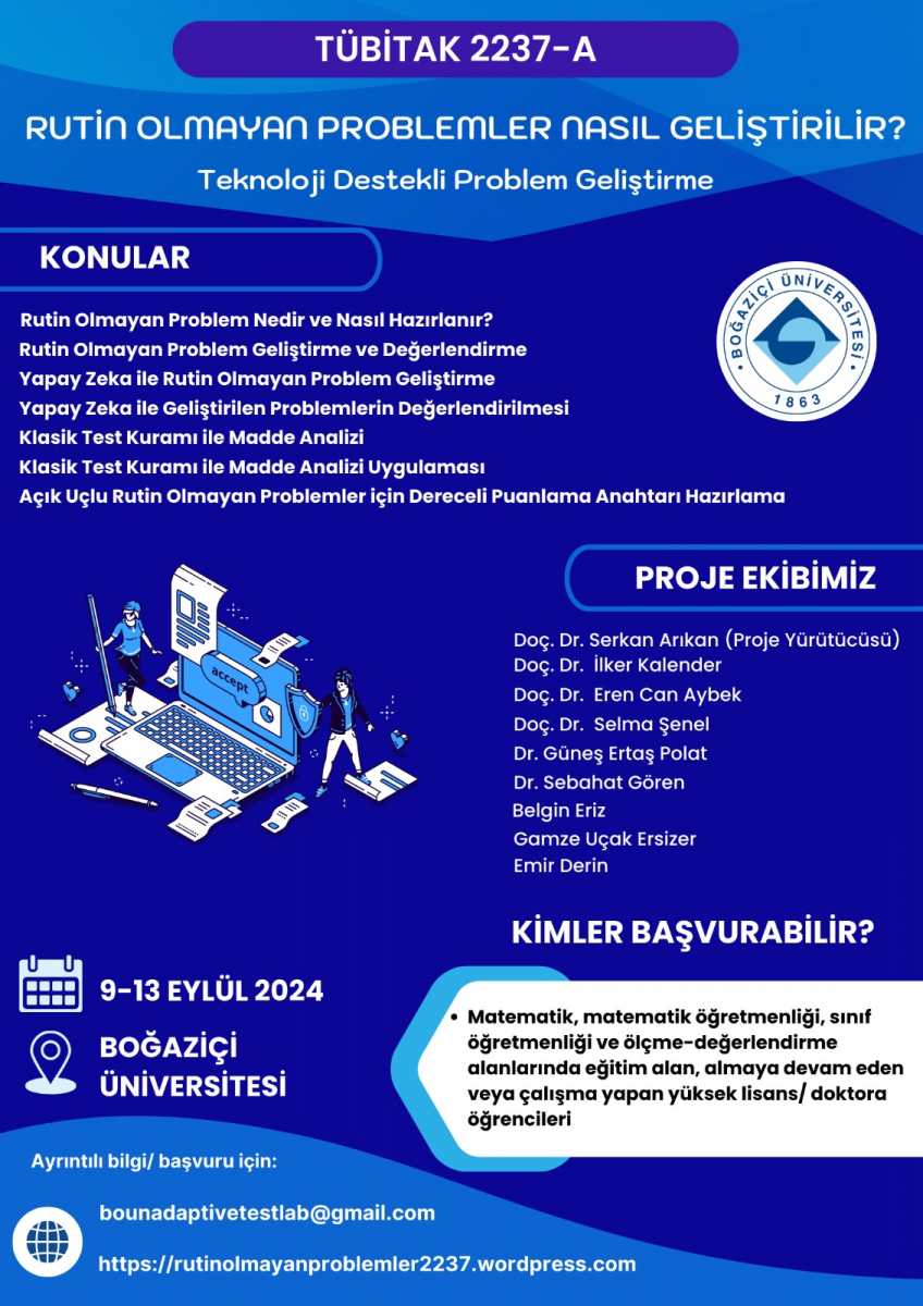 BounAdaptiveTestLab olarak hazırladığımız “Rutin Olmayan Problemler Nasıl Geliştirilir? - Teknoloji Destekli Problem Geliştirme” başlıklı eğitim etkinliğimiz TÜBİTAK 2237-A kapsamında desteklenmeye hak kazanmıştır.
