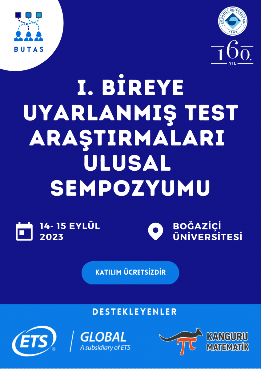 1. Bireye Uyarlanmış Test Araştırmaları Sempozyumu, BounAdaptiveTestLab tarafından 14–15 Eylül 2023 tarihlerinde düzenlenmiştir. Sempozyumda bireye uyarlanmış testler ile ilgili 30 bildiri sunulmuştur. Sponsorlukları için ETS Global ve Kanguru Matematik’e teşekkür ederiz.